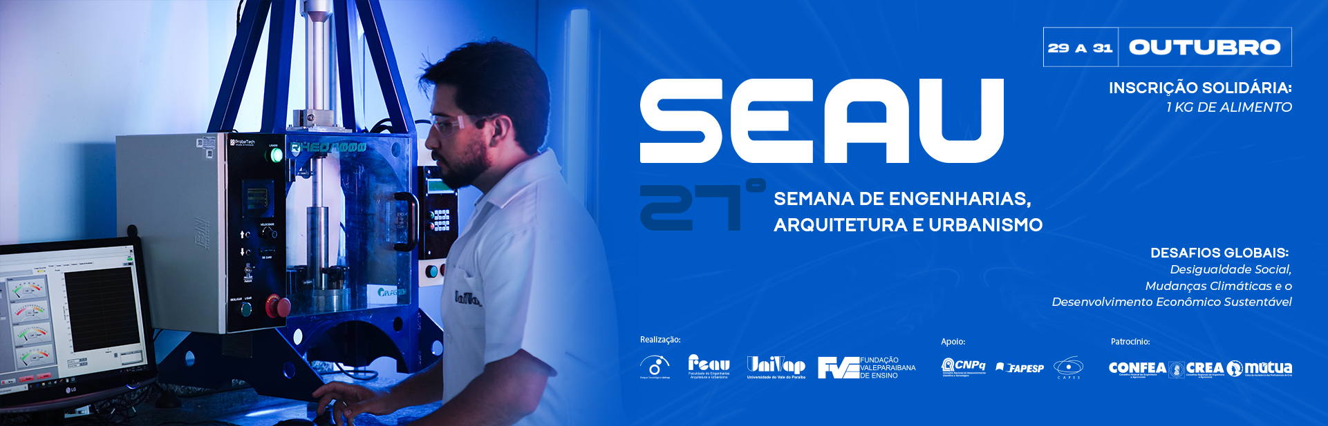 A SEAU (Semana das Engenharias, Arquitetura e Urbanismo) é um evento consolidado no calendário acadêmico da Univap, que promove, ano após ano, discussões fundamentais sobre o papel transformador da ciência, da tecnologia e do planejamento urbano. Em 2025, o evento convida a comunidade universitária a refletir sobre o tema: “Desafios Globais: Desigualdade Social, Mudanças Climáticas e o Desenvolvimento Econômico Sustentável.”