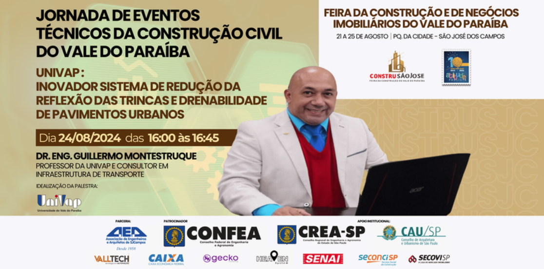 Neste sábado (24), além da exposição, o Dr. Eng. Guillermo Montestruque, Professor da Univap e consultor em infraestrutura de transporte, irá subir ao palco para sua palestra com o tema de “Inovador sistema de redução da reflexão das trincas e drenabilidade de pavimentos urbanos”.