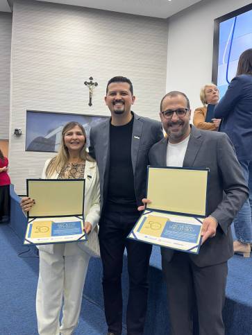Na noite da última segunda-feira (20), oito profissionais de enfermagem de São José dos Campos foram homenageados em uma Sessão Solene na Câmara Municipal, dentre os enfermeiros estavam a diretora da FCS, Profa. Dra. Ivany Baptista, Prof. Esp. Thiago Nilson de Carvalho e a coordenadora do curso de Enfermagem em Dermatologia, Profª Drª Maria Helena S. Mandelbaum.