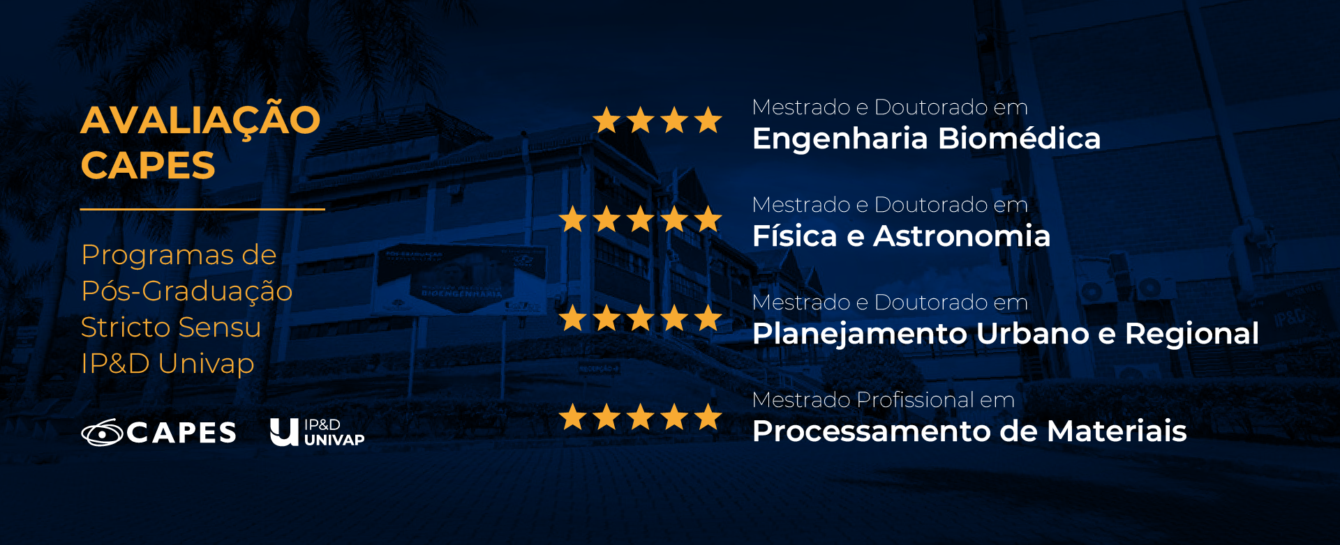Na avaliação mais recente da Capes, os programas da Univap obtiveram notas expressivas, que indicam o nível de qualidade e consolidação de cada curso. Os Programas de Mestrado e Doutorado em Engenharia Biomédica alcançaram conceito 4, enquanto os Programas de Mestrado e Doutorado em Física e Astronomia, Planejamento Urbano e Regional e o Mestrado Profissional em Processamento de Materiais conquistaram nota 5.